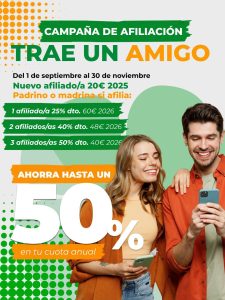 Desde el 1 de septiembre hasta el 30 de noviembre del 2025, estará vigente la campaña para nuevos afiliados que estén apadrinados por afiliados, beneficiándose los dos con descuentos en la cuota del 2026.