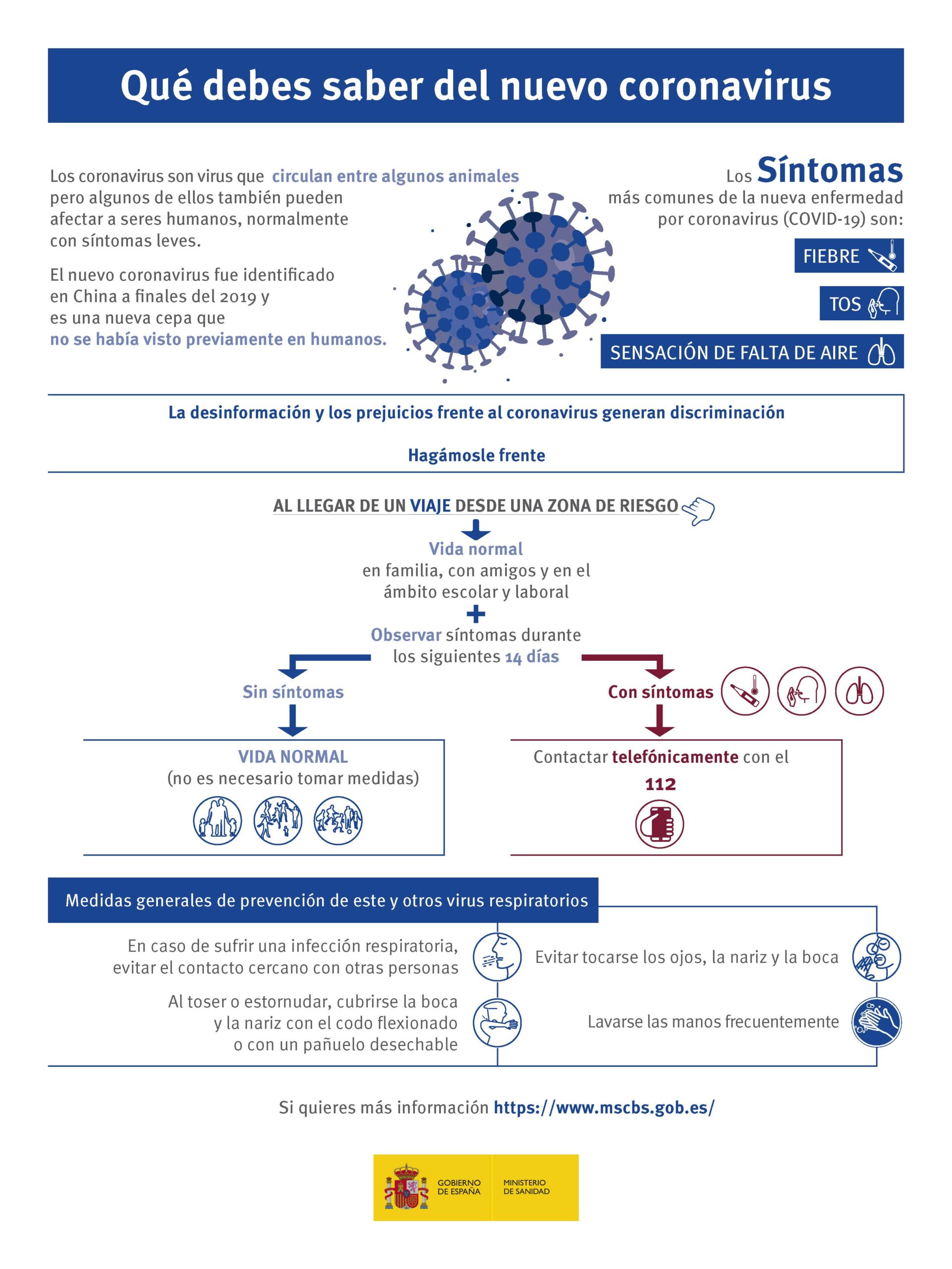 El Ministerio de Sanidad ha desarrollado en colaboración con las comunidades autónomas y en línea con la Organización Mundial de la Salud (OMS), y con otros organismos internacionales como el Centro Europeo para la Prevención y Control de Enfermedades (ECDC) un procedimiento para la detección precoz de casos de infección por el nuevo coronavirus. Con el fin de contribuir a la contención del mismo el Ministerio ha difundido una infografía con información sobre el virus, sus síntomas y el protocolo a seguir para prevenir contagios que recomienda difundir en los centros educativos y podéis descargaros aquí.