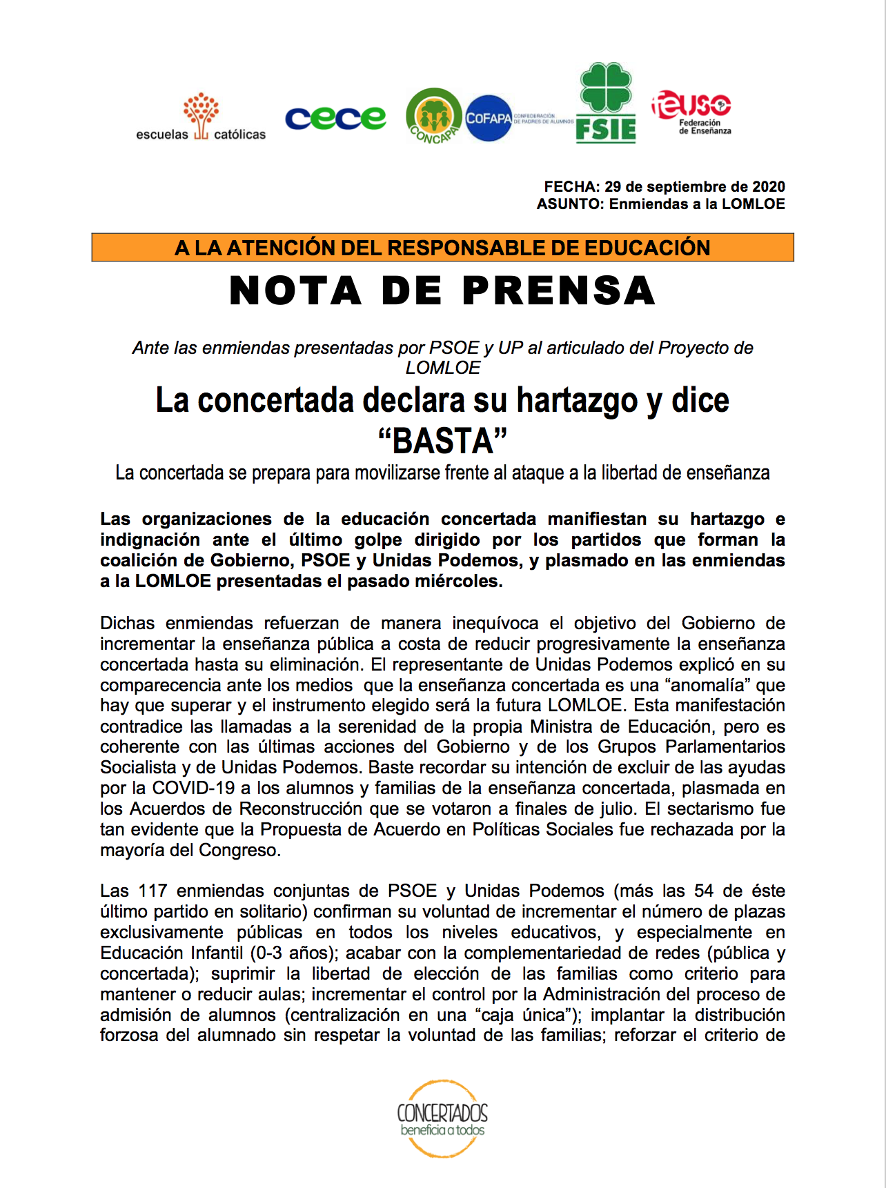Las organizaciones de la educación concertada manifiestan su hartazgo e indignación ante el último golpe dirigido por los partidos que forman la coalición de Gobierno, PSOE y Unidas Podemos, y plasmado en las enmiendas a la LOMLOE presentadas el pasado miércoles.