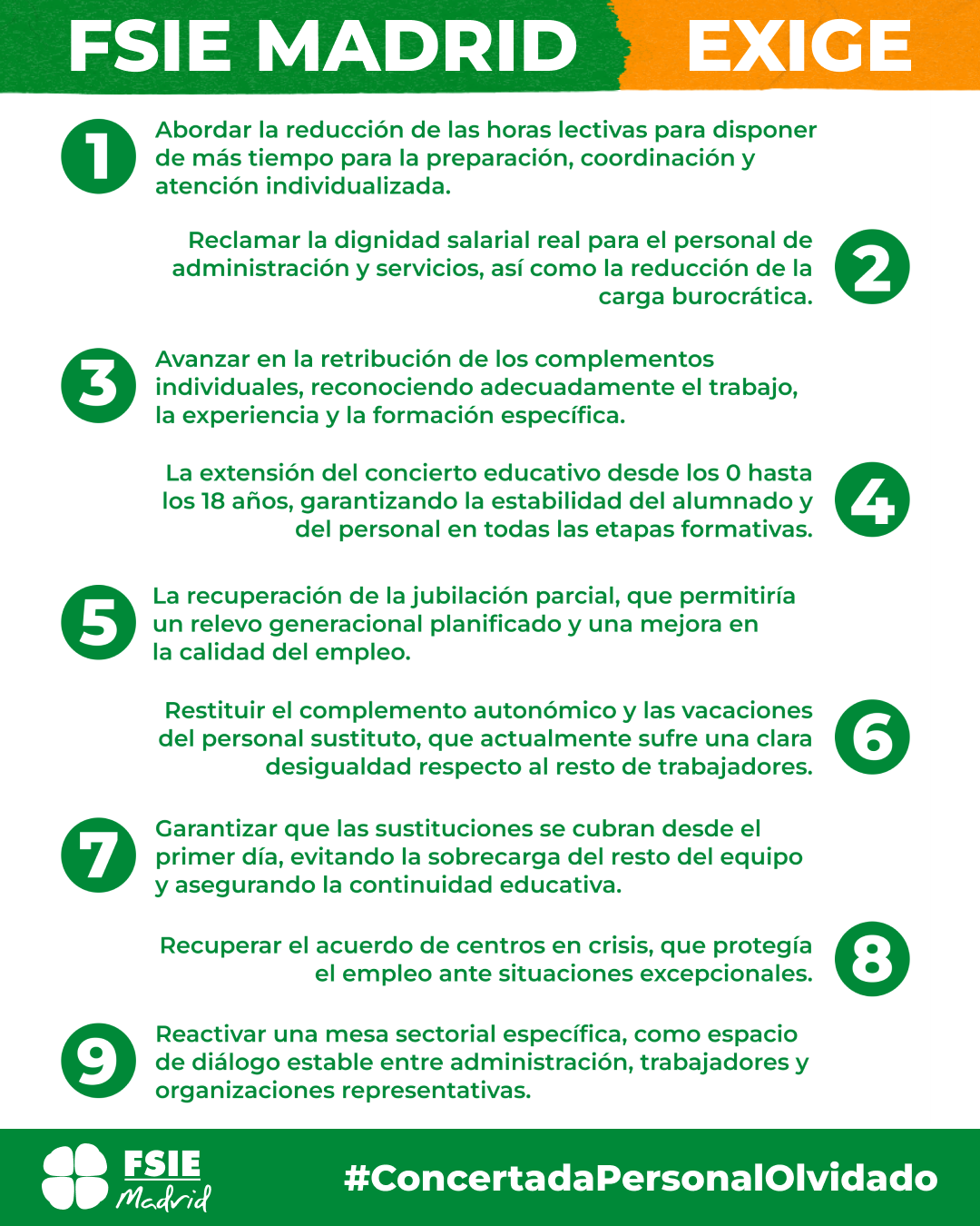 La enseñanza concertada madrileña merece un trato justo y avances reales. FSIE Madrid, USO, UGT y CCOO hacen un llamamiento a todo el personal del sector para que se involucre en esta campaña. El compromiso, la profesionalidad y el esfuerzo diario del personal de la concertada no pueden seguir ignorándose.