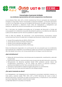 Ante esta situación, desde FSIE Madrid junto al resto de sindicatos del sector mantenemos viva la campaña “Concertada: el personal olvidado”, que se refuerza con nuevas movilizaciones frente a la sede de la Consejería (C/ Alcalá, 32, Madrid). Las dos primeras citas, de otras que vendrán serán:
